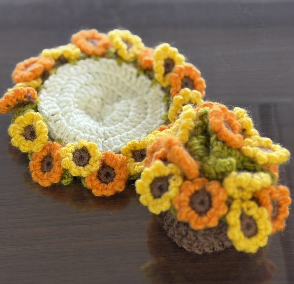 職員が心を込めて作った布の牛や、もぐぴよ、そして手編みのお花たち。