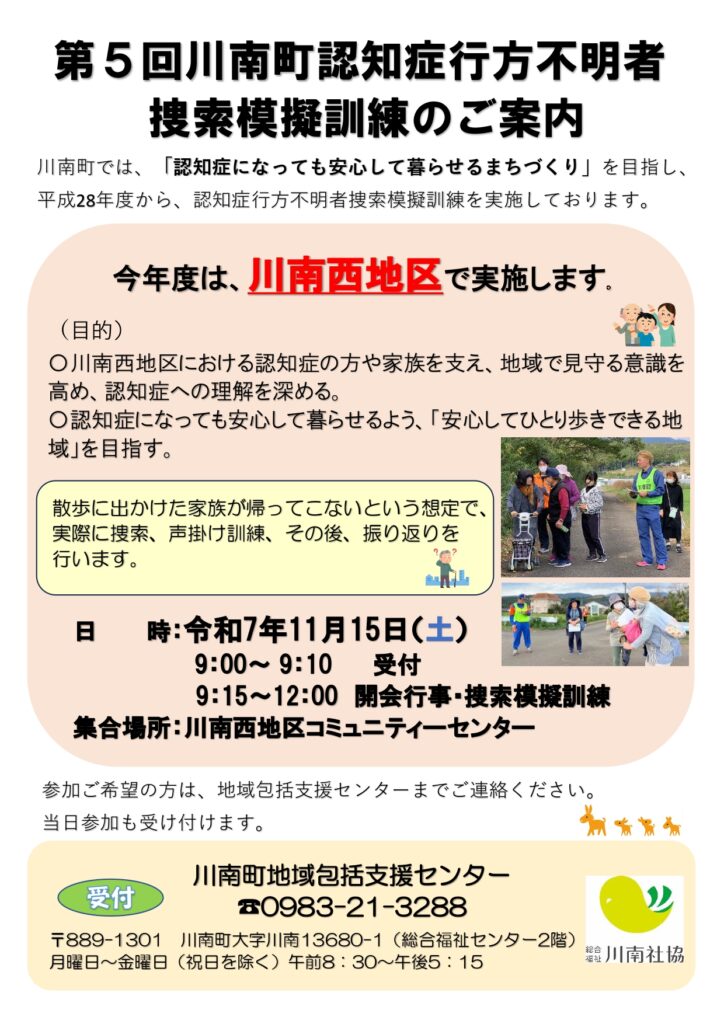 川南町では、「認知症になっても安心して暮らせるまちづくり」を目指し、認知症行方不明者捜索模擬訓練を実施しています。